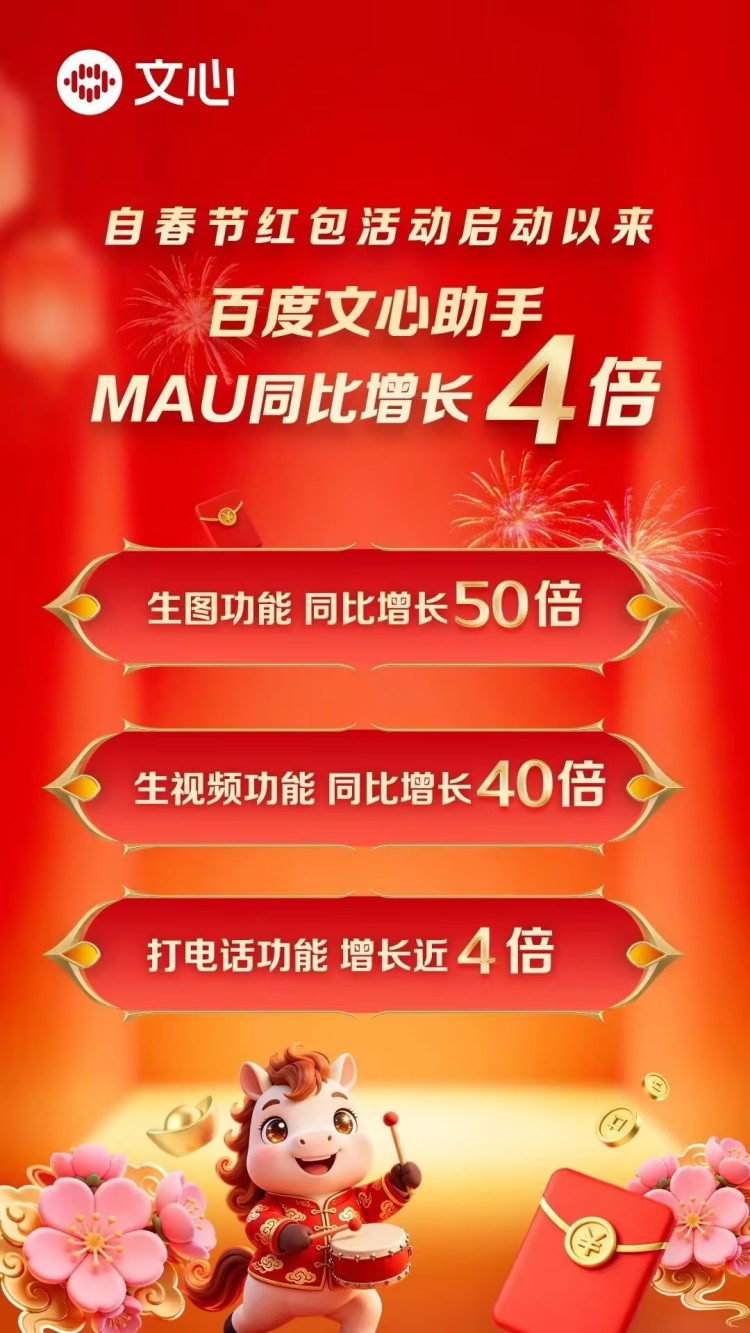 【环球网科技综合报道】2月11日,百度发布文心助手核心数据。自春节红包活动开启,百度APP文心助手月活跃用户同比猛增4倍,功能使用量更是呈爆发式增长:AI 生图同比增长50倍,AI生视频增长40倍,AI打电话功能增长近5倍。