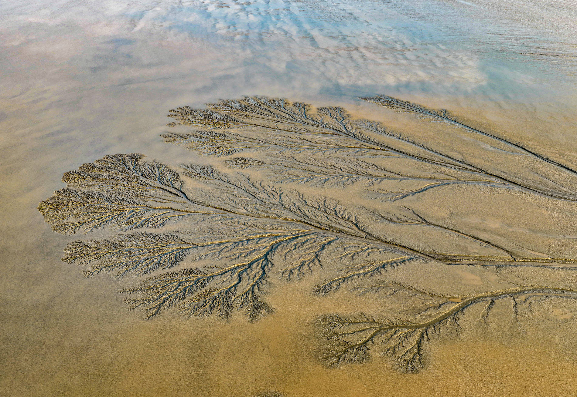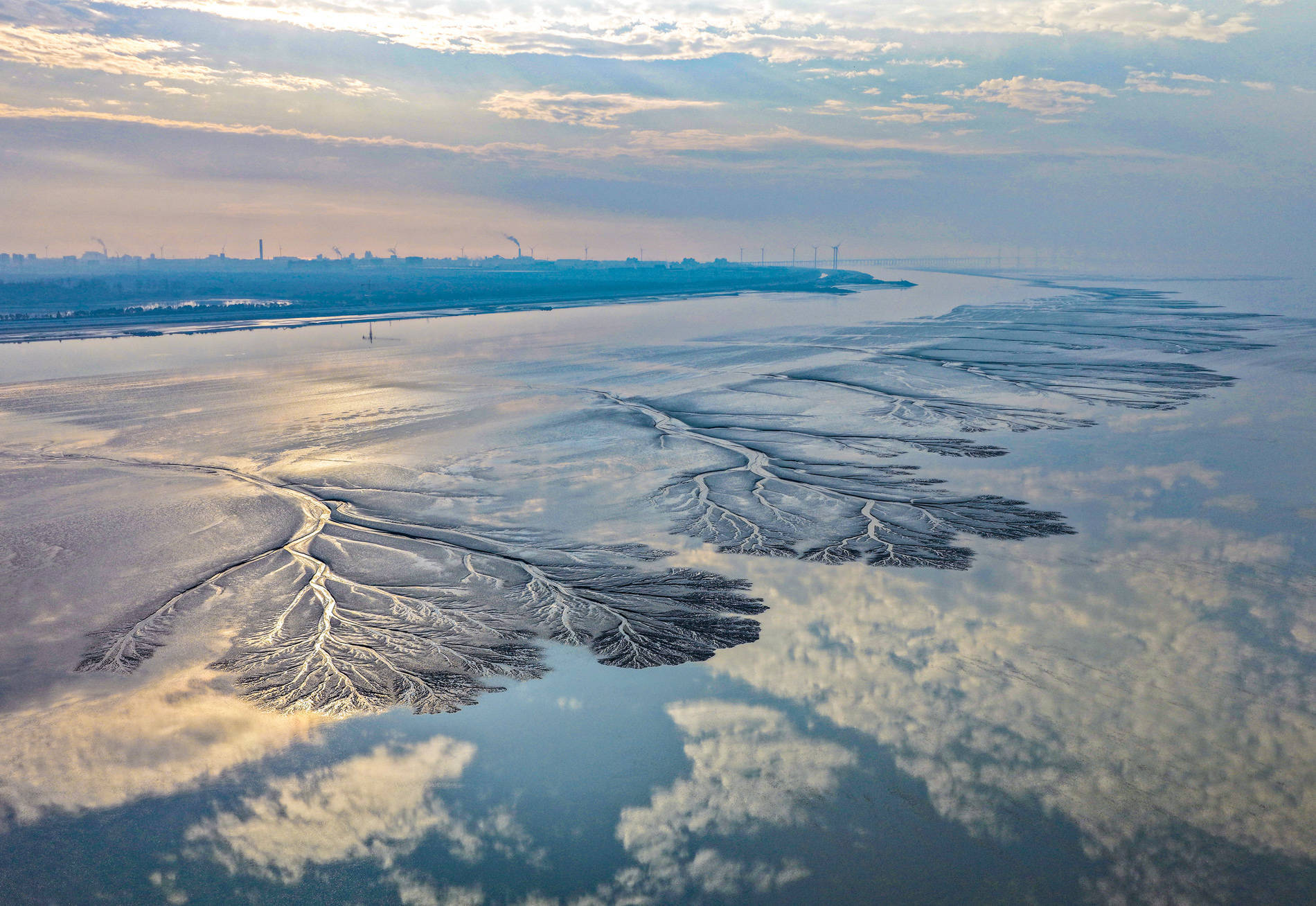 ↑2026年1月4日在浙江嘉兴海宁钱塘江黄湾镇段拍摄的“潮汐树”景观。(无人机照片)CICPHOTO/张连华 摄